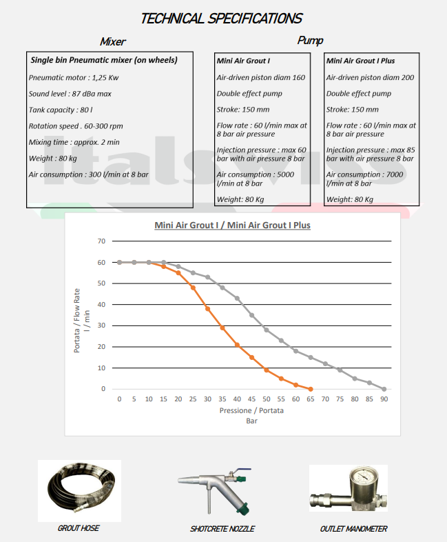 Pneumatyczny zestaw mieszająco-iniekcyjny Mini Air Grout został zaprojektowany z myślą o uproszczeniu pracy i transportu na trudnych placach budowy. Mocny siłownik pneumatyczny może zapewnić wydajność 60 l/min i ciśnienie do 85 bar, dzięki czemu doskonale sprawdza się w następujących zastosowaniach: