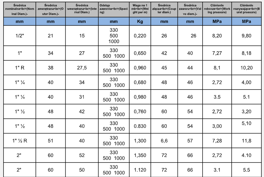 Rura posiada dwa gwinty oraz gumowe manszety w odstępach 0,33 m, 0,5 m lub 1 m. Wszystkie standardowe średnice są podane w tabeli danych technicznych poniżej.